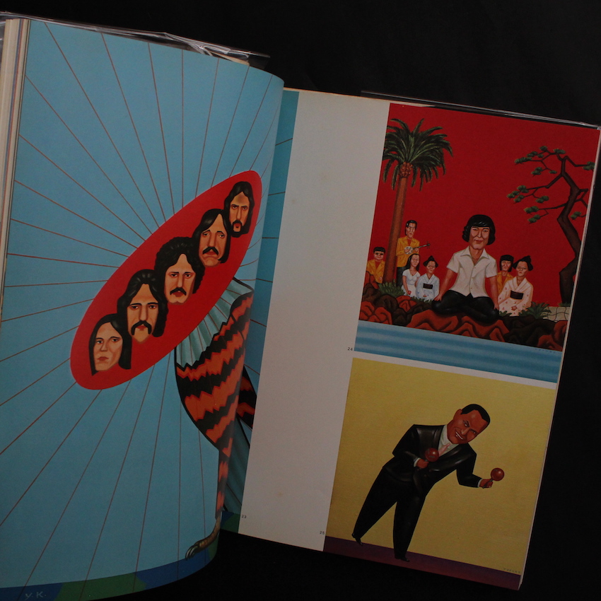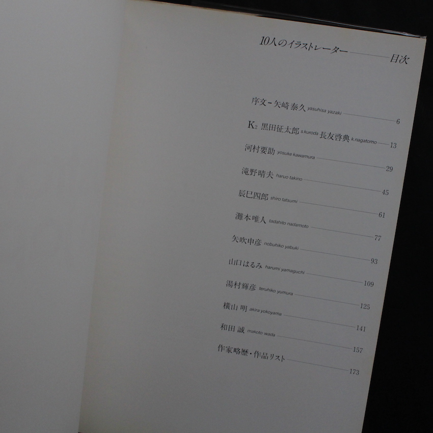本書は、1980年に刊行された作品集『10人のイラストレーター / 10 Illustrators in Japan』。タイトルの通り、10名の男女のイラストレーター、デザイナーの作品が紹介された一冊で、70年代を代表するアーティストが勢揃い。山口はるみを始め、河村要助、K2(黒田征太郎+長友啓典)、滝野晴夫、辰巳四郎、灘本唯人、矢吹申彦、湯村輝彦、横山明、和田誠。構成・装幀は田中一光。序文は矢崎泰久。大判サイズでスケールの大きい70年代らしい作品が連なります。