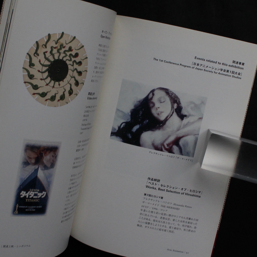 本書は、1999年に東京都写真美術館で行われたエキシビジョン『ビーイング ・デジタル - アニメーションとメディア』展を機に刊行された小さなカタログで、アニメーション分野の中でも特にデジタル化やCGに焦点を当てて、多様なメディアへの拡張や表現の可能性について考察されたものです(本展序文より)。会場では、「人狼 - JIN-ROH」や「バンパイアハンターD」の映像などが紹介されたほか、「エースコンバット 3 エスクトロスフィア」なども登場。普段は目にすることのない原画・コンテ・特殊効果などもふまえて、アナログからデジタルへの移行も体感できるような内容となっていました。世界的に高く評価されるジャパン・アニメーションの可能性についても言及されています。