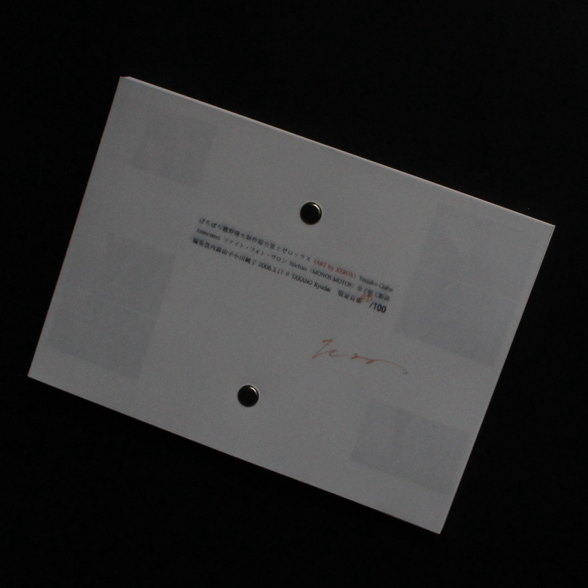 日本の写真家・鷹野隆大の写真集『ぱらぱら / ParaPara(Signed)』。1980年代半ば、早稲田大学政経学部時代に知人による舞台撮影の依頼をきっかけに本格的に写真を開始。90年代より個展で作品を発表。男性のヌードやジェンダーの美、さらには毎日欠かさず続けているというありきたりの日常のスナップ「毎日撮影」など、一般的には「美しくない」「何も感じない」と思われるようなところに、新たな視座を与えるような事実を写真表現を通じて行い続けており、感性のみならず非常にロジカルな面も合わせ持つインテリジェントな鷹野隆大。本書は、2006年に木村伊兵衛写真賞の授与を機に行われた展示の際に、100部限定で刊行された作品集。男性が服を脱ぎ、セミヌードとなっていく様を、ぱらぱらとページを捲ることで露わになっていく仕様。中央部にハトメがなされ、両サイドをめくりながら見るユニークなデザイン。エディションナンバー入り。写真家サイン入り。